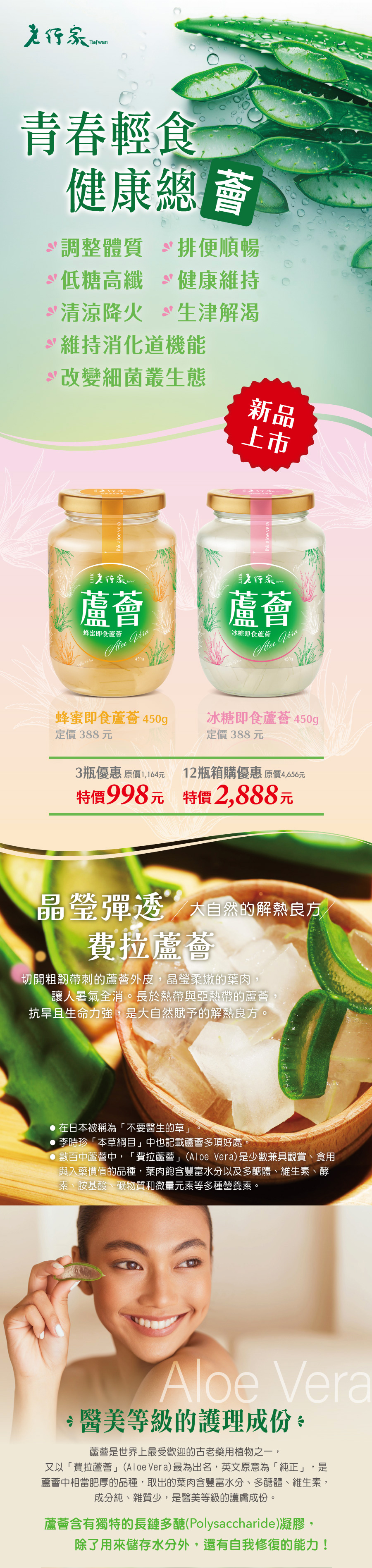 供應商名稱:老行家國際燕窩股份有限公司商品名稱:【老行家】即食蘆薈(三瓶組)內容量(g/ml)::450g+-3% (固形量:260g+-6%)/瓶數量:三瓶・冰糖口味成份:蘆薈、水、冰糖、砂糖、檸檬酸・蜂蜜口味成份:蘆薈、水、砂糖、蜂蜜、檸檬酸・營養標示:食用方式:請使用乾燥潔淨湯匙,依所需的份量舀出食用,食用後之湯匙請勿重複舀取。